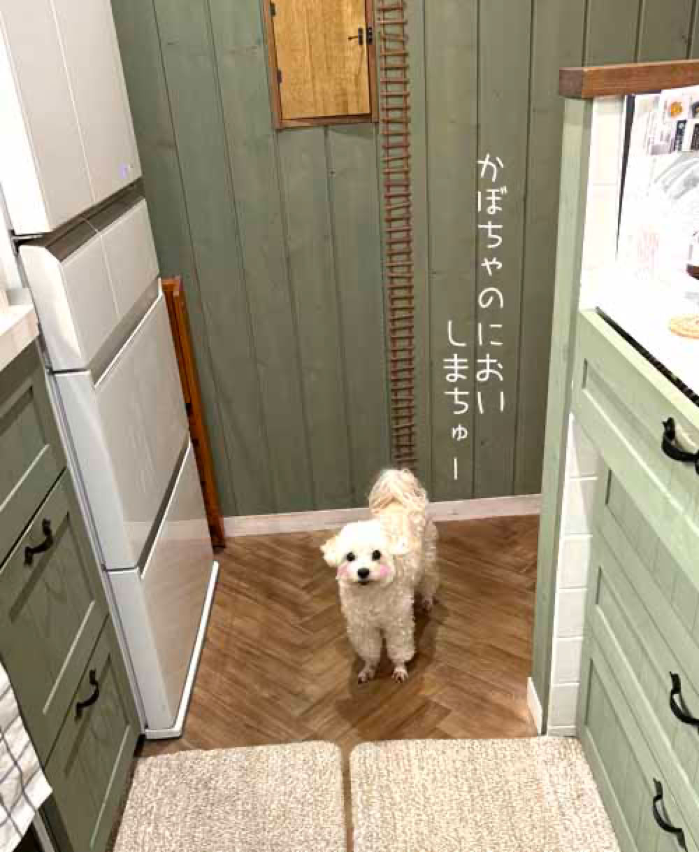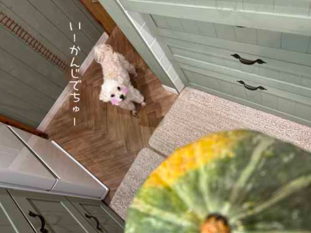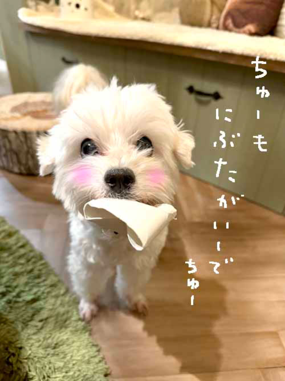 2024年11月7日(木) まつげちゃんがきたのん。だっこちてもらっておなかなでなでちてもらってうれちかったのん。でも、いちばんはまつげちゃんのつくってくれたブタさんがたべたくてテーブルのしたでよいこ「まて」ちてたんでちゅよ。