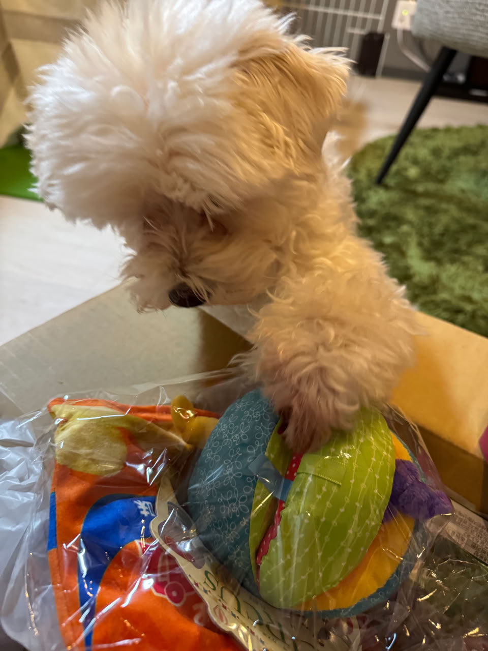 2025年12月15日(月)ちゅーちゃんは、せんせいからクリスマスプレゼントをいただきまちた。おやつをはさむボールでちゅー。わーいっちゅーちゃん、せんせいがだいすきなのん。いつも、おうちにきてくれたときはおなかだして、なでてーってあまえたんでちゅよ。
